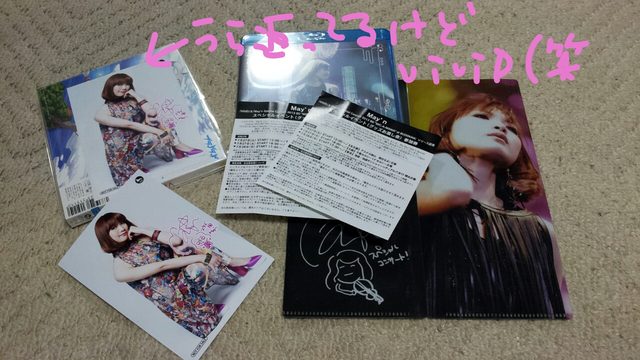 今日アニメイトさんまでお迎えいってきましたーーーー─=≡Σ((( っ'∀')っ!レジにてどきどきわくわくしながらお会計してるときに、ふと店員さんを見ると手元にはイベント参加券が一枚しかなくて…「これ1枚だけしかないんですか??商品ひとつに対して1枚じゃないんですか??」と食い下がったところ申し訳ありませんと他の特典とともに持ってきてくれはりました(((o(*゚▽゚*)o)))そして店員さんテンパったのかブロマイドはすでにCDに挟まれてるのにもう1枚くださいましたw家に帰ってきてからわたしも気づいたっていうwなにはともあれリリイベ参加券げとっ!母とともに参戦する予定です*\(^o^)/*