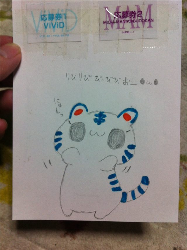 マイマニとViViD買えば応募できる奴で、応募券だけだと寂しいので、裏にへたっぴなりに頑張ってお気に入りキャラのトララ描いてみたお(●ω●*)