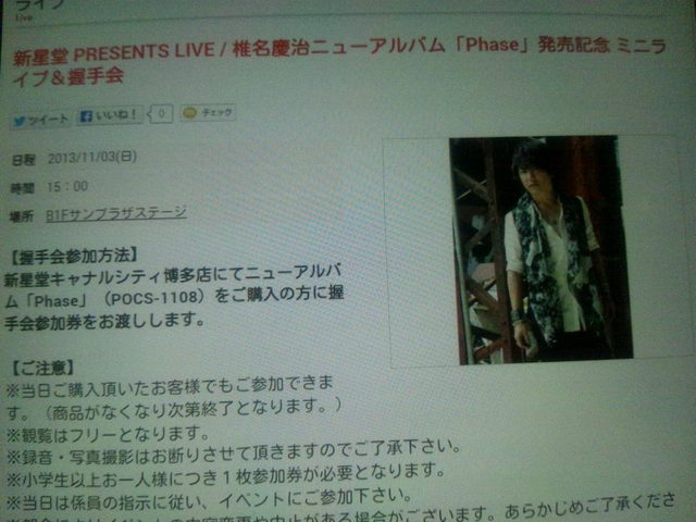 見にくいですねm(。_。)m見つけちゃいました。。11月3日(日)15時〜☆。。キャナルCITY博多で椎名慶治サンのミニライ部&握手会が あります!!詳しくわ キャナルのホームページで!!─=≡Σ((( っ'∀')っいつかこんな風に May'nチャンも キャナルCITY博多で ライ部やって欲しいなぁ─=≡Σ((( っ'∀')っ希望☆。。土曜日なら 椎名慶治サンに 逢いに行けたのに(;´д`)残念…紅葉家族旅行やから(微笑)