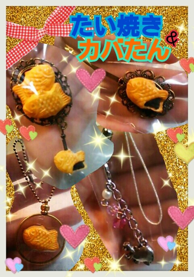 たい焼きグッズとかカバグッズがなぃよぉ〜っ!!(>_<)……と、嘆いていたら、イベント等で雑貨サークルをしてる友人が作ってくれましたwwwwwwちゃんと、あんことか付いてるんですよ。可愛い〜っ!!ブローチ、ヘアピン、キーチェーン、ストラップです♪メイスペ投稿許可いただいたのでお披露目ですwコレ部員さんに売れると思うの(笑)今回試作って事でいただいちゃいました。今度ライ部に付けて行きたいと思います♪ヽ(*´∀`)ノ