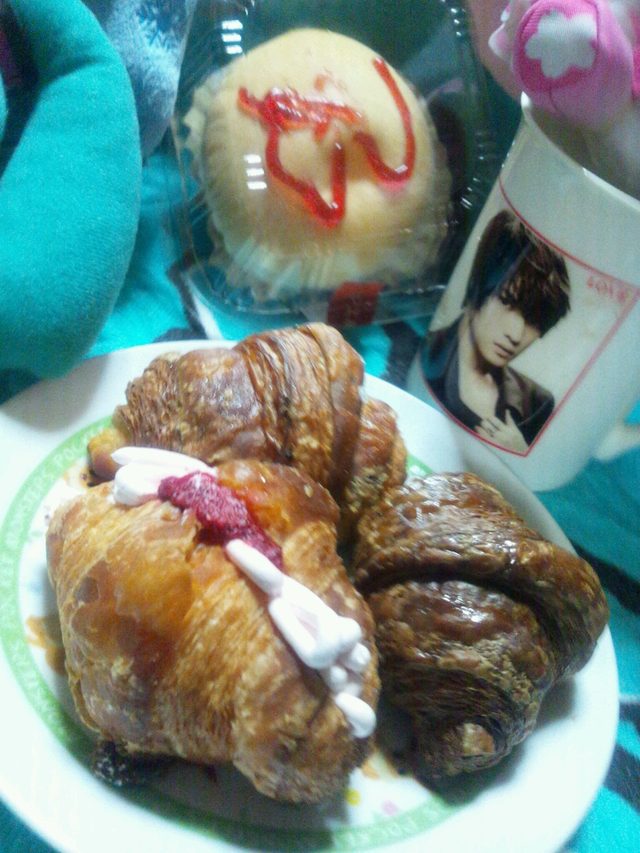 お天気が 良くなりました☆。。それでも(>艸<")まだまだサ部サ部…インフルにノロ…風邪…他…に、気を付けて下さいね。。ミク・雪・桜 達とジェジュンカップで、昨日のパン屋サンで購入したクロッサン─=≡Σ((( っ'∀')っ苺cream・チョコ・芋餡ふっくら米粉パンを頂きます─=≡Σ((( っ'∀')っ。。