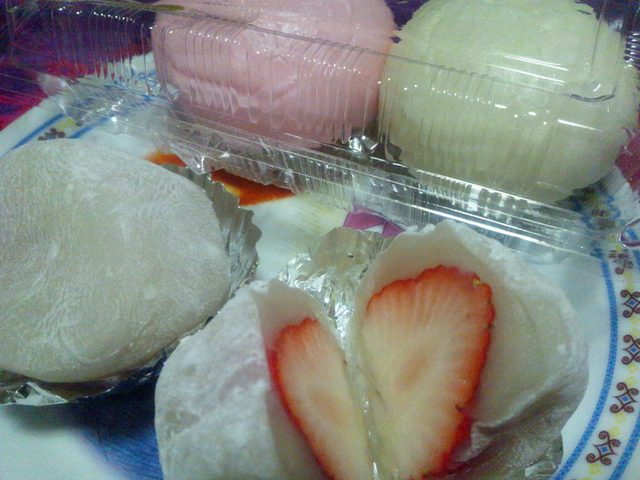 熊本人吉の⊂(^(工)^)⊃部ッ産展。。いちご大福 六個買ったら(* ̄艸 ̄)酒饅頭pinkとwhite☆。。つけてくれました!!!いちご大福は 苺のまわりが、白餡でした。。苺の果汁たっぷり 甘かったょ♪