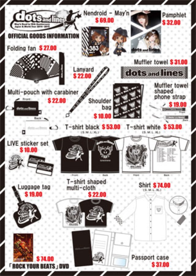「dots and lines」ツアー 7/17(木)ロサンゼルス&7/20(日)サンフランシスコ公演でのグッズ販売情報です! ◆販売グッズラインナップ ※上記ラインナップは予定商品です。やむを得ず当日販売できない商品が発生する場合もございますこと、何卒ご容赦ください。 ※「ねんどろいど May’n」はお一人さまひとつまでのご購入とさせていただきます。 (イベント終演後在庫がある場合は在庫がある限りご購入いただけます) ◆グッズ販売開始時間 7/17(木)ロサンゼルス 19:00 7/20(日)サンフランシスコ 19:00 ※上記2公演では先行販売は無く、開場後の販売開始となります。 ※上記時間は現地時間となります。