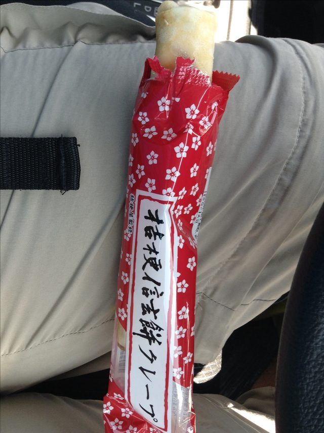 かなり遅くなりましたが、山梨どあら参加された皆様お疲れ様でした。天候もライブも本当に熱かった!場所はちょうど後方にあった柱の真裏w。部長が柱で見切れるというポジションでした。でも、久しぶりのどあら参加最高に楽しかったです。もう汗びっちょり。 残念ながら時間も少なく観光はなし。名産品?らしいものは写真の信玄餅クレープだけでした。 又、山梨行くのでその時こそは!