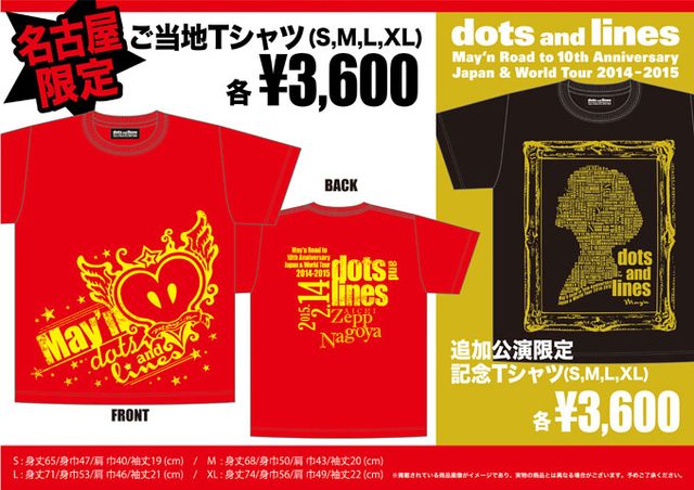 お待たせしました! 先日お知らせした「dots and lines」追加公演での限定展開のうちのひとつ、「限定グッズ」の発表です! 当日の会場でしか手に入れることの出来ない、追加3公演各会場ごとの「ご当地Tシャツ」を販売(...)投稿「dots and lines」追加公演限定グッズのお知らせ!はMay'n Official Siteの最初に登場しました。
