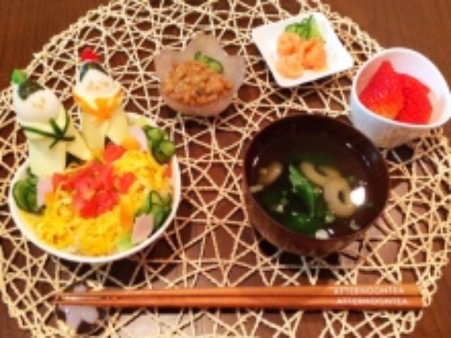 3月3日っ。ひな祭りっ!ちらし寿司は作ったことあったけど、今日はゆっくりひさびさに料理したいなあと思い、可愛く☆お内裏様とお雛様は、クックパッドを参考に。ほんとはもっとひらぺったいお皿にちらし寿司よそおいたかったんだけど、長いピックで作って足になっていたので、ごはんに刺したけど、かなり安定感あってよかったっちらし寿司は、素をつかったので錦糸卵とトマト、アボカドを刻んだもの、塩もみしたキュウリ、花びらの形に切ったニンジン、ハムも飾って。ほんとはサーモンを飾ろうと思ったけど、スペース的に微妙だったので小皿に移動w隣は納豆。お吸い物は、ちらし寿司についてたやつに三つ葉をいれたデザートは、イチゴっ。あー。やっぱり料理たのしいな。たまーにキャラ弁っぽいことやりたくなるw今日、たまたまこの桜の箸置き見つけて一目惚れ。あー、やっぱり和食器もかわいい。ひな祭りも大好きな行事に入りそう、、、!