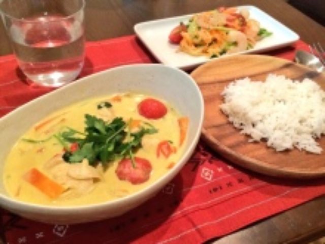 写真は、今日の夜ご飯。21:30すぎにお仕事から帰ってきたんだけど自炊したい欲が半端なくてわりとしっかり作った─=≡Σ((( っ'∀')っタイで買ったペースト使ってグリーンカレー!っていってもほんとは同じく買ってきていたペーストを使ってトムカーガイ(真っ白なココナッツスープ)作ろうとしてて、材料もそれを揃えていたのに、鍋にいれてたら、ん?茶緑になってきたぞ?、、ひぃい!これカレーのほうや!とwカレーなもっとイモとかピーマンとか入れたかったなw冷蔵庫になかったータイ米はロンドンのスーパーで安かったので買ってきたもの。この独特な香りがすき。サラダは、よく作るカルパッチョのレシピで。スライサーしたタマネギ、もらったしりしり機でやったニンジンをさとうでモミモミ。細かく切ったキュウリ、セロリエビ、トマトを入れて味付けはお酢、オリーブオイル、粒マスタード少し、塩とブラックペッパーを少々、で混ぜ混ぜして冷やしておくだけ!セロリいれたらグッとエスニックな雰囲気になりました◎ごはんおかわりするくらい( ゚д ゚)ウマーくできたよでも遅くなのでガマン、、近々トムカーガイつくるぞおおお