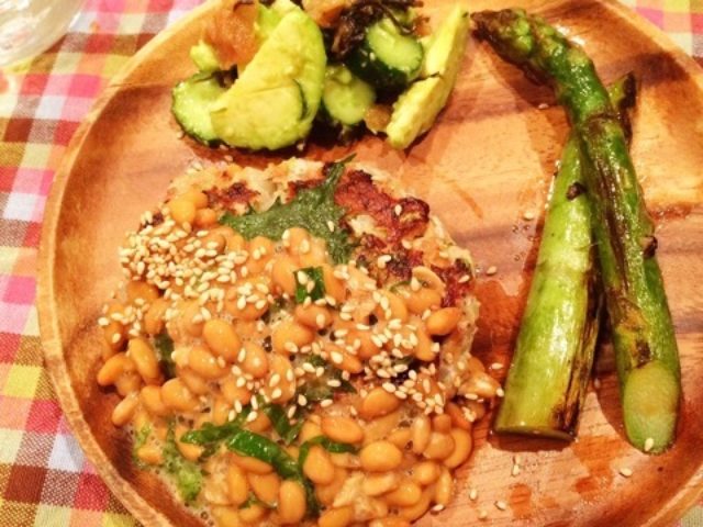 筋肉にも美容にも、たんぱく質!!ということで、意識的に摂るようにしています夕飯は、餃子を作ろうと思ったけど皮を買い忘れ、へとへとで皮を作る気力もなかったのでハンバーグに。豚肉を白菜を塩コショウとごま油、ニンニクみじん切りでこねて大葉と一緒に焼いて和風ハンバーグ!いつもハンバーグを作る時も、豚肉100%なんだけど、おうちでもパサつかなくてふわふわにできるよ納豆は常に家にあるのですが、ポン酢ダレだったのでそのまま大葉みじん切りと一緒にハンバーグにかけたんまんまハンバーグを弱火でじっくり蒸し焼きにしたんだけど、一緒にアスパラも焼いてたら、めちゃくちゃ甘くて美味しかった~アボカドも常備。アボカドときゅうりを塩昆布と梅で和えただけ~栄養も考えて、しかもへるしぃな夕飯にできたけど、彩りがな~ニンジンとかトマトとか欲しかったです( ゚A ゚)簡単料理だったけど、自分好みにできるからやっぱり楽しい\(^o^)/