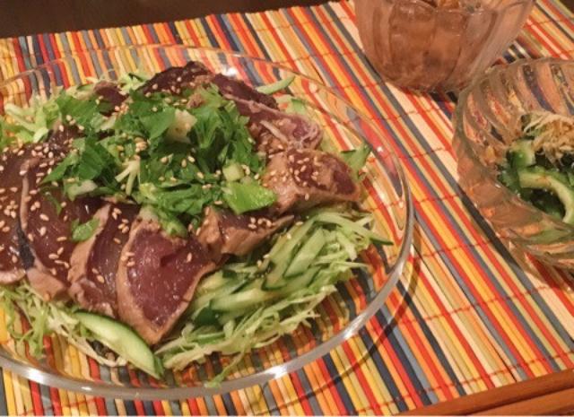 さっぱりカツオのたたき~キャベツの千切り上手くなってきたっ。キャベツ、キュウリの上にタタキのせて上にセロリをネギの代わりにっ。タタキについてたタレにおろしニンニクとごま油、醤油を足してスタミナも増します~ゴーヤをサッと茹でて、塩麹と白だしで浅漬けもさっぱりうまうま~もう一品は納豆☆ビタミンたっぷり夏メニューでした~